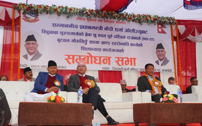 पुरा पढ्नुहोसकाठमाडौँ । प्रधानमन्त्री केपी शर्मा ओलीले विकास निर्माण र पूर्वाधारका हिसाबले अब नेपाल अघि बढिसकेको बताएका छन् । बुटवल–गोरुसिङगे सडक खण्डको स्तरोन्नति कार्यको शिलान्यास तथा सम्बोधन सभालाई शुक्रबार भर्चुअल माध्यमबाट मन्तव्य दिँदै प्रधानमन्त्री ओलीले सुरुडमार्ग,...