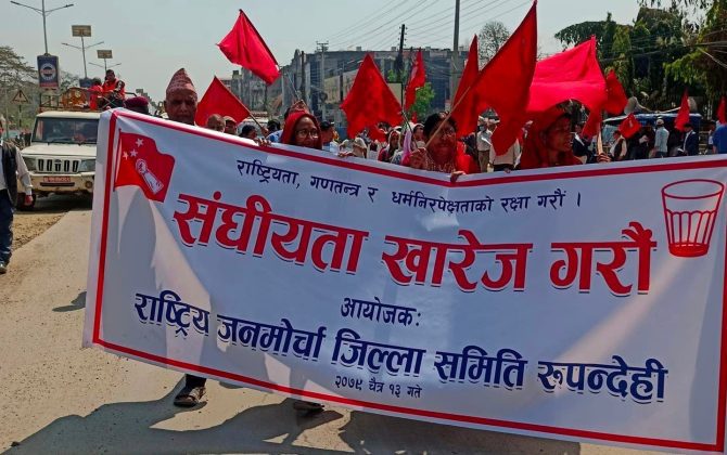 पुरा पढ्नुहोसराष्ट्रिय जनमोर्चाले यही सालको चैत २४ गतेदेखि ३० गतेसम्म काठमाडौँमा सङ्घीयताका विरुद्ध राजधानीकेन्द्रित आन्दोलन गर्ने निर्णय गरेको छ । त्यसलाई सफल पार्नका लागि हामीले नेपालका सम्पूर्ण जनतासित राजनीतिक, नैतिक र आर्थिक सहयोग र देशभरिबाट...