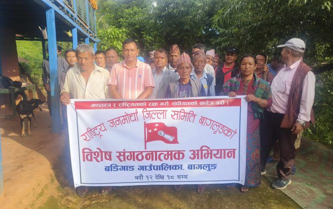 पुरा पढ्नुहोसराष्ट्रिय जनमाेर्चा बागलुङको विशेष संगठनात्मक अभियानकाे ७ ठाउँमा उदघाटन ! धुल्लुबास्काेट, कुश्मिशेरा, अमलाचाैर, दुदिलाभाटी, सक्न्यार, बुर्तिबाङ र राजकुटमा सम्पन्न !! २०८१ भाद्र १२ गते “गणतन्त्र र राष्ट्रियताकाे रक्षा गराैं ! संघीयताको खारेज गराैं !!´´भन्ने उदघाेष...