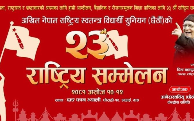 पुरा पढ्नुहोसदाङ । अनेरास्ववियु (छैठौं ) को २३ औं राष्ट्रिय सम्मेलन आजदेखि दाङको घोराहीमा हुँदैछ । उक्त सम्मेलनलाइ राष्ट्रिय जनमोर्चाका अध्यक्ष चित्र बहादुर केसीले सम्बोधन गर्ने कार्यक्रम छ। सम्मेलनको सम्पूर्ण तयारी पूरा भएको र देशभरिबाट प्रतिनिधिहरू...
