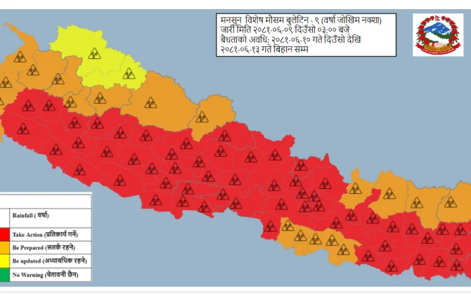 पुरा पढ्नुहोसमंगलबारदेखि सक्रिय बनेको मनसुनी प्रणालीका कारण बिहीबार दिउँसोबाट देशभर भीषण वर्षा हुने भएको छ। मौसम पूर्वानुमान महाशाखाले बुधबार विशेष बुलेटिन जारी गर्दै आइतबार बिहानसम्म सातवटै प्रदेशमा भीषण वर्षा हुने र केही ठाउँमा अत्यधिक वर्षाको...