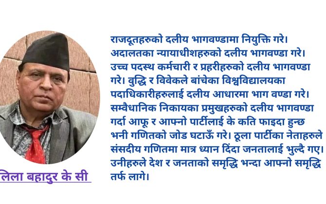पुरा पढ्नुहोसलिला बहादुर के सी सम्वीधान संकटमा पर्नुको पृष्ठभूमि हामी सर्वसाधारण जनताहरु आफ्नै देशमा पृथ्वी नारायण शाहको पालाको हलोको प्रविधि प्रयोग गरेर पनि खेत वारी जोती दुई छाक खाएकै थियौं। समयले ल्याएको विकासका विभिन्न आयामसंग अनुकूलित भै...