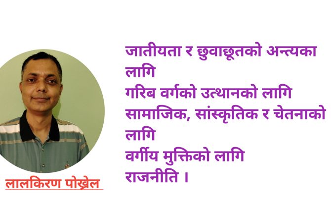 पुरा पढ्नुहोसलालकिरण पोख्रेल देशलाई विश्वमा नमुना बनाउनकाे लागि देशको चाैतर्फी विकासका लागि देशको नयाँ राजमार्ग तयारीका लागि रामराज्य निर्माणका लागि राजनीति । देशलाई अग्रगमन पथमा लैजान शासनव्यवस्था कुशल बनाउन जनतालाई शान्ति र सुरक्षा दिन स्वदेशमा राेजगारीकाे अवसर सिर्जना गर्न राजनीति । आधुनिक र वैज्ञानिक शिक्षा प्राप्तिकाे...