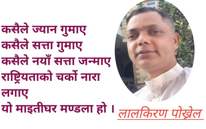 पुरा पढ्नुहोसलालकिरण पोख्रेल याे माइतीघर मण्डला हाे राजधानीको मुटु हाे वारिपारि चमेलीका बास छन् चिल्ला गाडी सडकमा कुद्छन् याे माइतीघर मण्डला हाे । एउटा ठूलो राष्ट्रिय झण्डा छ चारैतिर पसलले घेरेकाे छ बीचमा माइतीघर अटल छ दैनिक हजारौं यात्री ओहोरदोहोर गर्दछन् याे माइतीघर मण्डला हाे...
