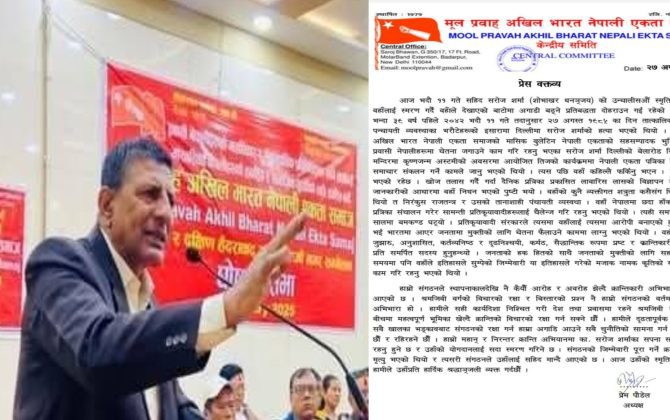 पुरा पढ्नुहोसशंकर प्रसाद पोख्रेल नयाँदिल्ली, २७ अगष्ट २०२५। मूल प्रवाह अखिल भारत नेपाली एकता समाजले सहिद सरोज शर्मा “शोभाकर धनञ्जय”को ३६औँ स्मृति दिवसको अवसरमा श्रद्धाञ्जली अर्पण गरेको छ। सन् १९८८ को अगष्ट २६ मा तत्कालीन निरङ्कुश पञ्चायती...