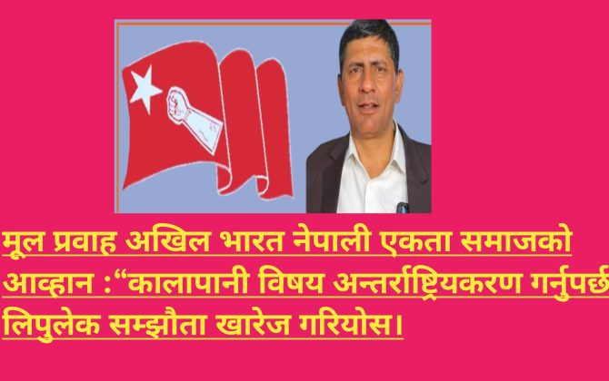 पुरा पढ्नुहोसमूल प्रवाह अखिल भारत नेपाली एकता समाजको आव्हान : ६ भाद्र २०८२, शुक्रबार नयाँ दिल्ली । मूल प्रवाह अखिल भारत नेपाली एकता समाजले सम्पूर्ण देशभक्त शक्तिहरूसँग राष्ट्रियताको रक्षाको लागि एकजुट भई सङ्घर्षमा उत्रिन आह्वान गरेको छ। अगस्त २२,...