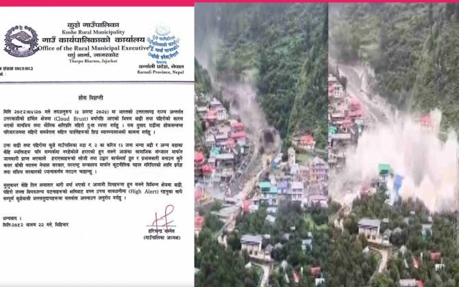 पुरा पढ्नुहोसभारतको उत्तराखण्ड राज्यमा आएको भीषण बाढी र पहिरोमा परी जाजरकोटको कुशे गाउँपालिकाका एकै वडाका १३ जनाभन्दा बढी नागरिक बेपत्ता भएका छन्। कुशे गाउँपालिकाले बिहीबार एक शोक विज्ञप्ति जारी गर्दै श्रावण २० गते उत्तराखण्डको उत्तरकाशीस्थित हर्षिल...