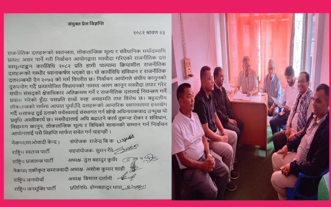 पुरा पढ्नुहोसपाल्पा निर्वाचन आयोगले स्वमुल्याङ्कनको नाममा राजनितिक दलको स्वायत्तता माथी गरेको हस्तक्षेपकारी कदमका विरुद्ध पाल्पा स्थित ६ दलहरुले त्यसको बिरोध स्वरुप आज संयुक्त प्रेसबिज्ञप्ति जारी गरेकाका छन। दलहरूले उक्त कदम नसच्चाए कडा आन्दोलन गर्ने चेतावनी समेत दिएका छन...