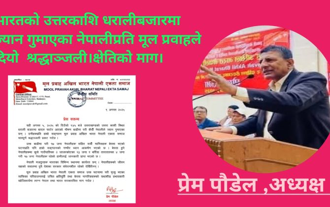 पुरा पढ्नुहोसरुपन्देही । उत्तराखण्डको धरालीबजारमा भारी वर्षापछि आएको बाढीमा परी ज्यान गुमाएका नेपालीप्रति मूल प्रवाह अखिल भारत नेपाली एकता समाजले श्रद्धाञ्जली व्यक्त गरेको छ । अध्यक्ष प्रेम पौडेलको हस्ताक्षरमा अगस्त ९, २०२५ का दिन शोकवक्तव्य जारी गर्दै...