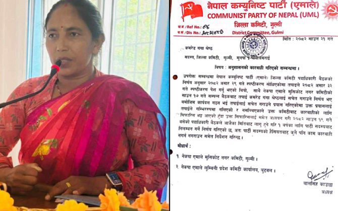 पुरा पढ्नुहोस२४ साउन, रुपन्देही । नेकपा एमालेले गुल्मीको मुसिकोट नगरपालिकाकी उपप्रमुख गंगा श्रेष्ठलाई निलम्बन गरेको छ । जिल्ला कमिटी गुल्मीको पदाधिकारी बैठकले श्रेष्ठलाई एक वर्षका लागि पार्टी सदस्यबाटै निलम्बन गरी निष्कासन गरेको हो । जिल्ला कमिटी गुल्मी...
