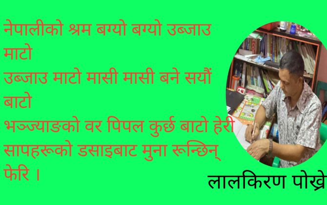 पुरा पढ्नुहोसलालकिरण पोख्रेल चुनाैतीका पहाडहरू फाेट्दै फाेट्दै जाउ कर्णालीकाे भेलसरि जुध्दै जुध्दै आउ सुनाैलाे बनाउनु छ विशाल हाम्रो राज्य स्वीकार्य छैन हामीलाई मातृभूमि भाज्य । अग्ला अग्ला हिमालहरू सधैं मुस्कुराउँछन् लहलह धानका बाला सधैं झुलिरहन्छन् बहुजाति भाषाधर्म नेपालीको पहिचान नयाँ नेपाल निर्माण गर्न...