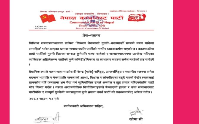 पुरा पढ्नुहोसगुल्मी । नेपाल कम्युनिस्ट पार्टी (नेकपा) गुल्मी जिल्ला कमिटीले पार्टीको गुल्मी–काठमाडौं सम्पर्क मञ्च नभएको बताएको छ । हुँदै नभएको मञ्च माओवादी केन्द्रमा समाहित भएको भनेर गरिएको प्रचार भ्रामक भएको जिल्ला कमिटीले आइतबार जारी गरेको विज्ञप्तिमा...