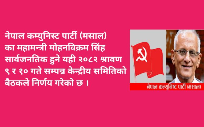 पुरा पढ्नुहोसकाठमाडौं । नेपाल कम्युनिस्ट पार्टी (मसाल) का महामन्त्री मोहनविक्रम सिंह सार्वजनतिक हुने यही २०८२ श्रावण ९ र १० गते सम्पन्न केन्द्रीय समितिको बैठकले निर्णय गरेको छ । बैठक पछि २०८२ श्रावण १२ गते महामन्त्री सिंहद्धारा...
