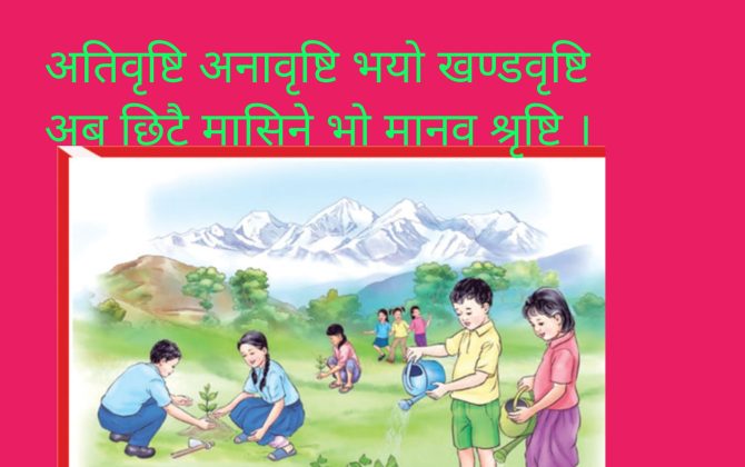पुरा पढ्नुहोसलालकिरण पोख्रेल अतिवृष्टि अनावृष्टि भयो खण्डवृष्टि २ अब छिटै मासिने भाे मानव श्रृष्टि । ३ दैनिक रूपमा बढ्दै गयो पर्यावरण विनास २ महाभारत चुरे मासी हुन्न विकास । ३ कहिले आउँछ हिमबाढी कहिले आउँछ खडेरी ।२ तराईका उब्जाउ भूमि भए...