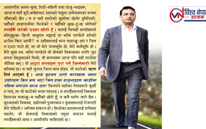 पुरा पढ्नुहोसबुटवल, ९ फागुन — रुपन्देही क्षेत्र नं. २ का उम्मेदवार सुवास पाण्डे ‘विश्वदीप’ले मतदातालाई भावनात्मक पत्र पठाउँदै आफू जन्मिएको र हुर्किएको भूमिको ऋण तिर्न चुनावी मैदानमा उत्रिएको बताएका छन्। सुवास पाण्डे ले कार्यकर्तामार्फत घर–घरमा पठाएको...