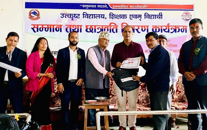 पुरा पढ्नुहोसगुल्मी, २३ असार । मदाने गाउँपालिकाको आयोजनामा उत्कृष्ट विद्यालय, शिक्षक तथा विद्यार्थीहरुलाई सम्मान गरिएको छ । जिल्ला समन्वय समिति प्रमुख द्रोण खत्रीले उत्कृष्ट सबै जनालाई सम्मान गर्नुभएको थियो । कार्यक्रममा स्वेच्छिक अवकाश कोष प्रोत्साहन अनुदानअन्तर्गत सेवा...