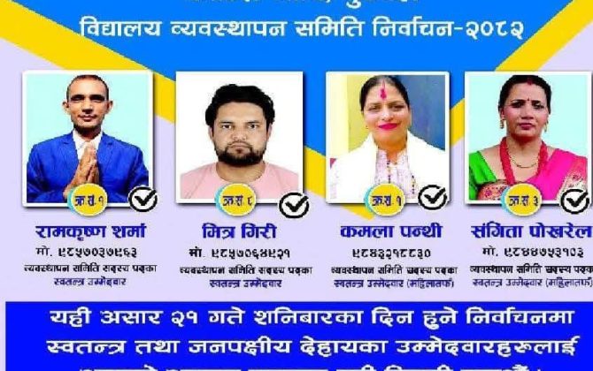 पुरा पढ्नुहोसशंकर प्रसाद पोख्रेल रुपन्देही ,मुख्य राजनीतिक दलहरुबीच भागबन्डामा कुरा नमिलेपछि बुटवलको कान्ति मावि विद्यालय व्यवस्थापन समितिको शनिबार निर्वाचन भएको हो । चार सदस्यीय पदका लागि १६ जनाबीच प्रतिस्पर्धा भएको थियो। २०८१ वैशाख पहिलो साता नै...