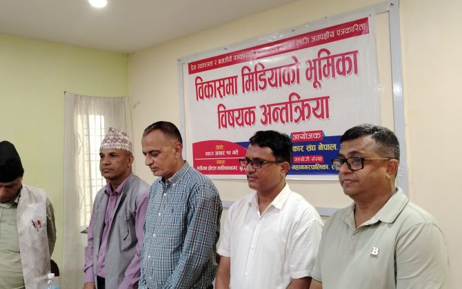 पुरा पढ्नुहोसस्यामलाल पोख्रेल बुटवल, असार १२ गते । प्रगतिशील पत्रकार संघ नेपाल रुपन्देहीको आयोजना र बुटवल उपमहानगरपालिकाको सहयोगमा बुटवलमा विकासमा मिडियाको भूमिका विषयक अन्तरक्रिया भएको छ । बिहीबार भएको उक्त अन्तरक्रियामा बोल्ने सहभागिले विकासमा मिडियाको भूमिका अहम रहेको...