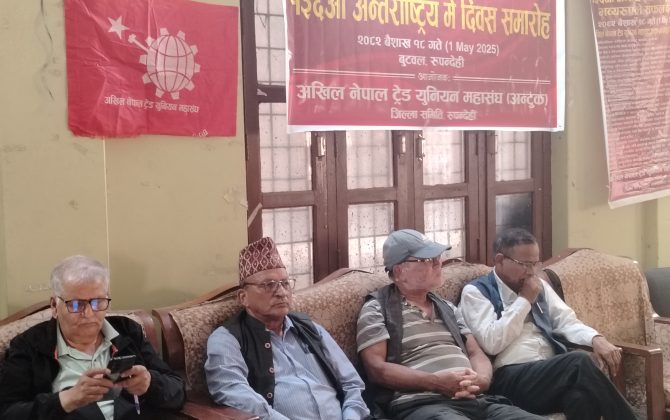 पुरा पढ्नुहोसशंकर प्रसाद पोख्रेल बुटवल रुपन्देही , अखिल नेपाल ट्रेड युनियन अन्टुकले रुपन्देहीमा १३६औं मजदुर दिवस मनाएको छ। मजदुर दिवस कार्यक्रममा बोल्दै प्रमुख अतिथी राष्ट्रिय जनमोर्चा केन्द्रिय सल्लाहकार बद्रे आलामले मजदुर आफ्नो हकहितको लागि आफै संघर्ष...