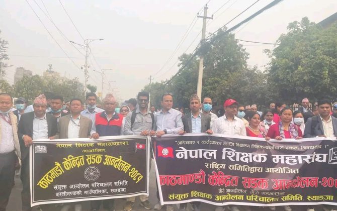 पुरा पढ्नुहोसमुलुकभरका सामुदायिक विद्यालयका शिक्षकद्वारा बिहीबार काठमाडौँको बबरमहलमा विद्यालय शिक्षा ऐन तत्काल जारी गर्न मागसहित गरिएको प्रर्दशन । प्रदर्शनमा मुलुकभरका सामुदायिक विद्यालयका स्थायी, अस्थायी, राहत दरबन्दीका शिक्षकलगायत सहभागी भएका छन् । ...