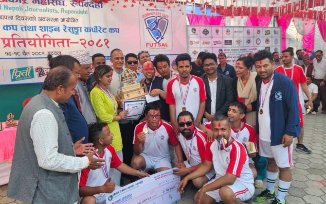 पुरा पढ्नुहोसरुपन्देही चैत्र- १८ नेपाल पत्रकार महासंघ रुपन्देहीको आयोजानमा भएको मिडिया कप फुटसल प्रतियोगीताको उपाधी ग्लोबल आवाज डटकमल र कर्पोरेट कप को उपाधी नेपाल ईन्जीनियर्स एशोसीयसन लुम्बिनीले जितेको छ । नेपाल ईन्जिनियर्स एशोसियसनले शंकरनगर खानेपानी...
