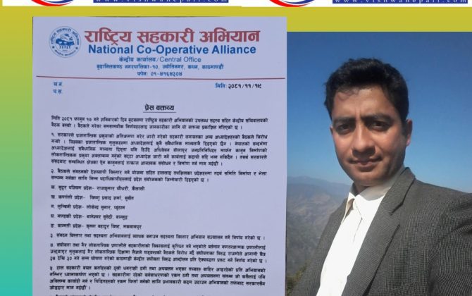 काठमाडौँ । राष्ट्रिय सहकारी अभियानले सहकारीपीडितको रकम फिर्ता गर्न माग गरेको छ । अभियानको २०८१ फागुन १७ गते रुपन्देहीको बुटवलमा सम्पन्न केन्द्रीय सचिवालय बैठकले सो निर्णय गरेको हो । अध्यक्ष गङ्गालाल सापकोटाको हस्ताक्षरमा फागुन १९ गते जारी...