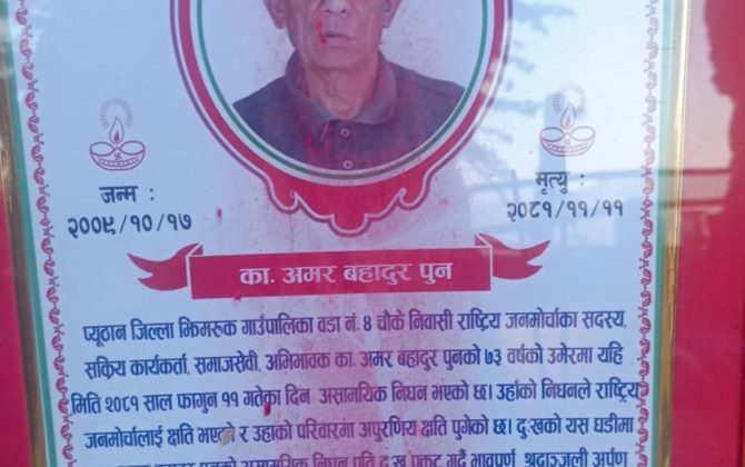पुरा पढ्नुहोसनारायण जिसी ,प्युठान ,झिमरुक राष्ट्रिय जनमाेर्चा झिमरुक गाउँकमिटीको आयोजनामा आज चाैकेमा श्रद्धाञ्जली सभा सम्पन्न भएको छ। अखिल नेपाल जनजाति सम्मेलनका नेता तथा राष्ट्रिय जनमाेर्चाका नेता अमर बहादुर पुनकाे ९ औ दिनकाे स्मृतिमा शाेक सभा भएको हाे। राष्ट्रिय...