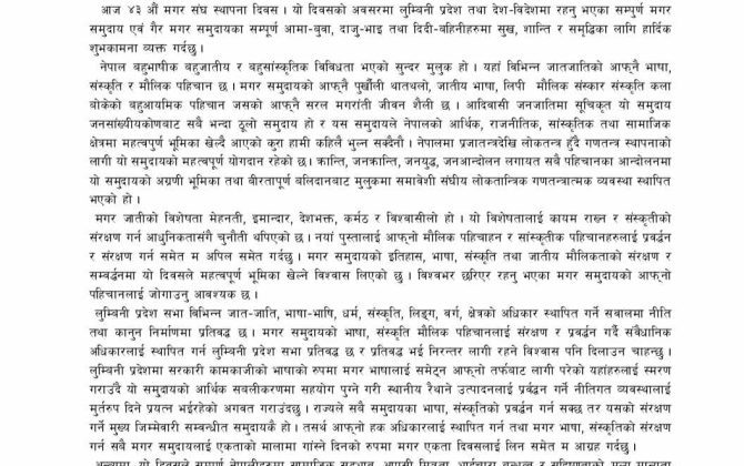 पुरा पढ्नुहोसफाल्गुन १५,बुटवल । लुम्बिनी प्रदेशका सभामुख तुलाराम घर्ती मगरले लुम्बिनी प्रदेशमा मगर भाषालाई सरकारी कामकाजी भाषाको रुपमा अंगिकार गराउने प्रतिवद्धता व्यक्त गर्नु भएको छ । ४३ औं मगर संघ स्थापना दिवसको अवसरमा आज विहान शुभकामना...
