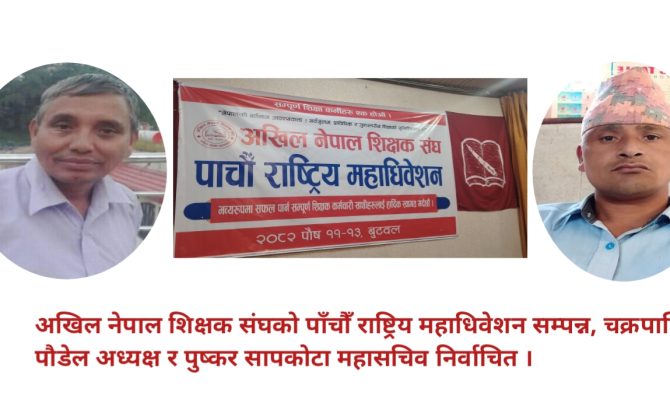 पुरा पढ्नुहोसबुटवल । अखिल नेपाल शिक्षक संघको पाँचौँ राष्ट्रिय महाधिवेशन यही पौष ११, १२ र १३ गते बुटवलमा सम्पन्न भएको छ। महाधिवेशनले अध्यक्षमा चक्रपाणि पौडेल र महासचिवमा पुष्कर सापकोटालाई सर्वसहमत रूपमा चयन गरेको छ। सानोभाइ कार्कीको...