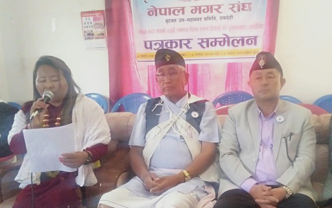 पुरा पढ्नुहोस१२ फागुन, बुटवल । नेपाल मगर संघ बुटवल उपमहानगर समितिले ४३ औं मगर दिवस (फागुन १५) पाँच दिवसीय रुपमा मनाउने भएको छ । नेपाल मगर संघ बुटवल उपमहानगर समितिले आइतबार बुटवलमा पत्रकारहरुसंगको भेट्घाटमा संघका...