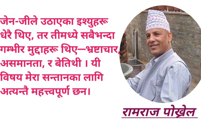 पुरा पढ्नुहोसरामराज पोख्रेल जेन-जी मेरो सन्तानको पुस्ता हो । मेरा लागि सन्तानभन्दा ठूलो कोही छैन । म वर्षौंदेखि आवाज उठाउँदै आएको छु—मेरा सन्तानहरूले बाध्यतावश देश छोड्न नपरोस् । रहरले जानेहरूप्रति मलाई कुनै गुनासो छैन । तर,...