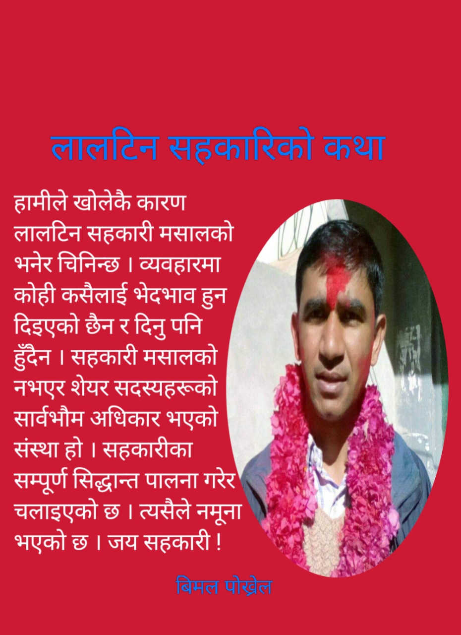 सुरुमा राजु पौडेल, सुनिता केसी, प्रकाश जीसी, कृष्ण जीसी, बाबुराम आचार्य, सुमित्रा सापकोटा, गोविन्द खनाललगायत साथीहरूको धेरै सहयोग रह्यो । पछि जोडिएका धेरै साथीहरूको सहयोग छ । मैले सबै साथीहरूलाई सम्झिएको छु । यो वर्ष पनि साधारणसभामा आउन पाइएन । हामीले खोलेकै कारण लालटिन सहकारी मसालको भनेर चिनिन्छ । व्यवहारमा कोही कसैलाई भेदभाव हुन दिइएको छैन र दिनु पनि हुँदैन । सहकारी मसालको नभएर शेयर सदस्यहरूको सार्वभौम अधिकार भएको संस्था हो । सहकारीका सम्पूर्ण सिद्धान्त पालना गरेर चलाइएको छ । त्यसैले नमूना भएको छ । जय सहकारी !