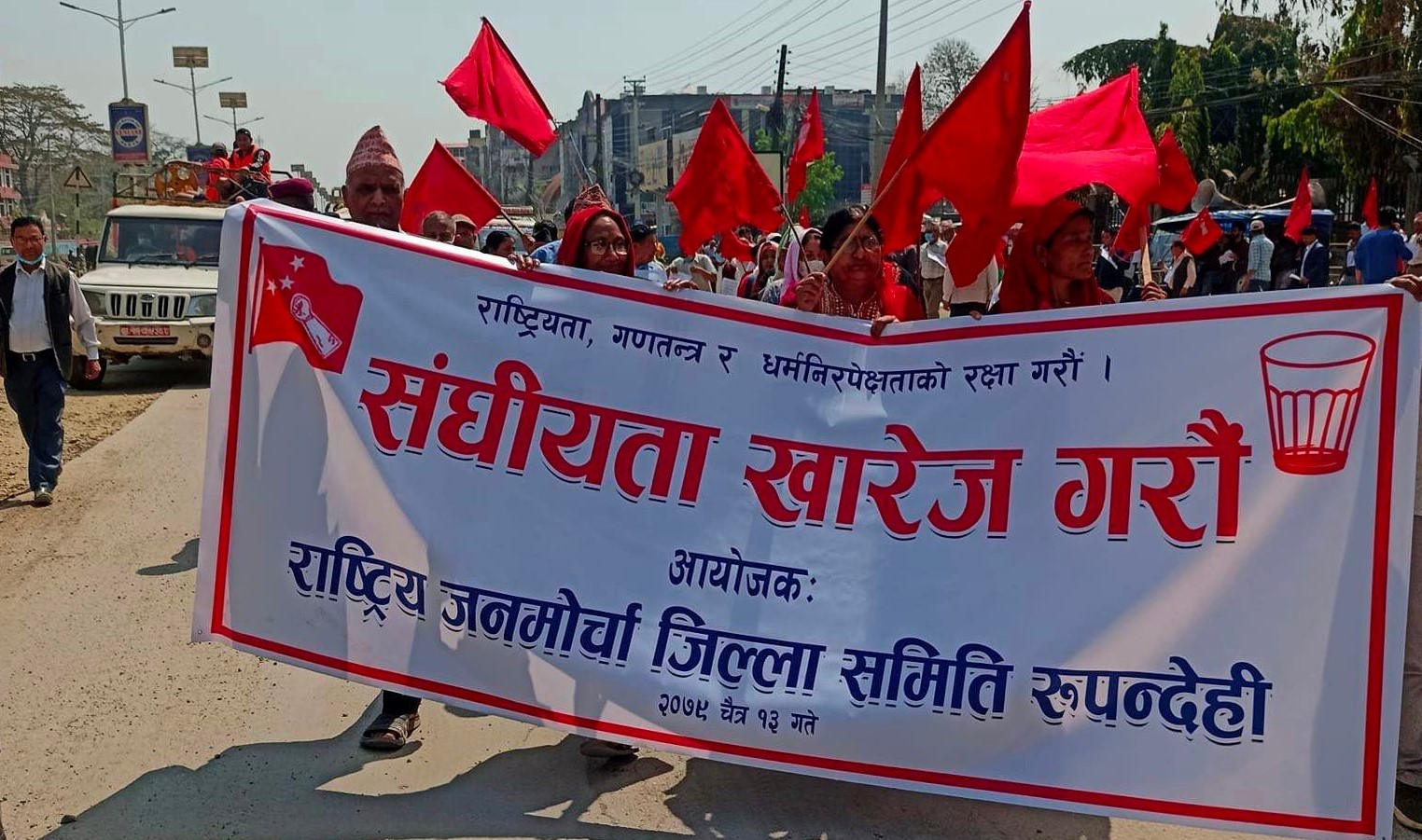 राष्ट्रिय जनमोर्चाले यही सालको चैत २४ गतेदेखि ३० गतेसम्म काठमाडौँमा सङ्घीयताका विरुद्ध राजधानीकेन्द्रित आन्दोलन गर्ने निर्णय गरेको छ । त्यसलाई सफल पार्नका लागि हामीले नेपालका सम्पूर्ण जनतासित राजनीतिक, नैतिक र आर्थिक सहयोग र देशभरिबाट नै व्यापक सहभागिताका लागि अपिल गर्दछौँ ।