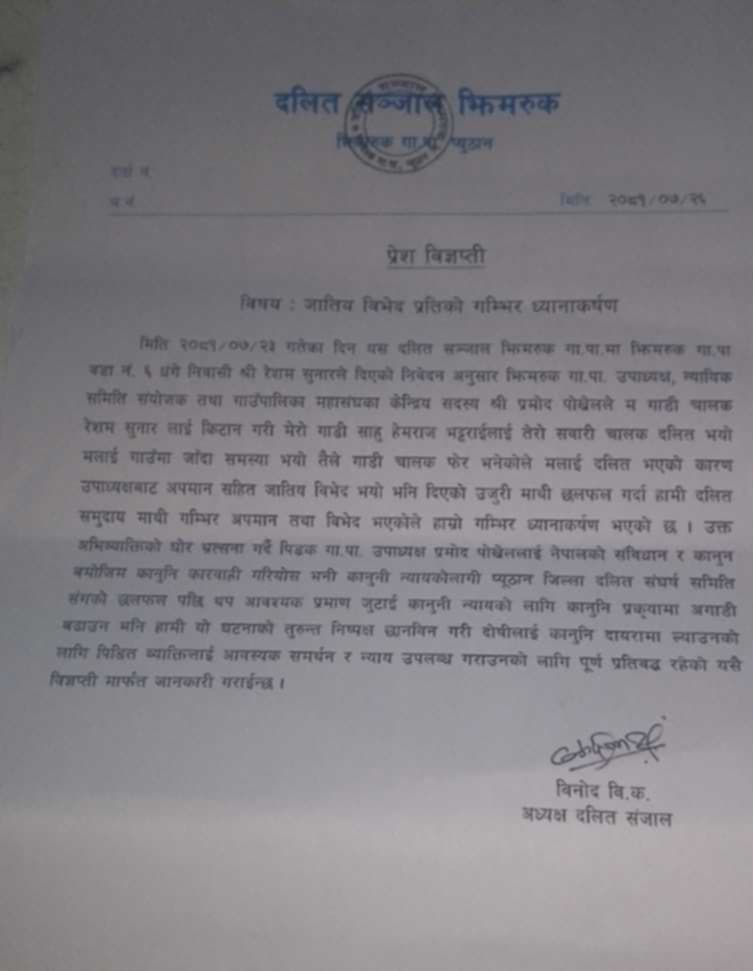 दलित समुदायका ड्राइभर भएका कारण घरमा पस्न समस्या भएको भन्दै प्युठानको झिमरुक गाउँपालिकाका उपाध्यक्षले ड्राइभरलाई हटाउन दबाब दिएको भन्दै दलित संज्ञाल झिमरुकले बिरोध जनायको छ।