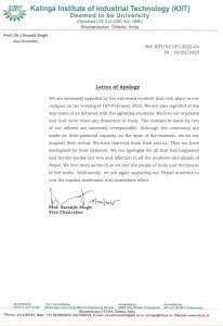 काठमाण्डाै – नेपाली विद्यार्थीहरूमाथि दुर्व्यवहार भएको घटनामा भारतको कलिङ्गा इन्स्टिच्युट अफ इन्डस्ट्रियल टेक्नोलोजी (केआईआईटी) ले माफी मागेको छ ।