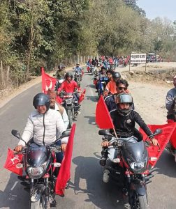 राष्ट्रिय जनमोर्चा दाङ्ले आगामी चैत्र २४ देखि राजधानी केन्द्रित सताब्यापी आन्दोलनको पुर्ब तयारी र प्रचार प्रसारको सिल सिलामा मोटरसाइकल जुलुस प्रदर्शन गरेको छ । राष्ट्रिय जनमोर्चा का केन्द्रिय सदस्य तथा दाङ जिल्ला अध्यक्ष गणेश आचार्यको नेतृत्वमा भएको प्रदर्शन गढबा १ कालाकाटेबाट सुरु भइ भालुबाङ , सिसहनिया , लमही , गढबा बजार हुदै महदेबामा पुगेर समापन भएको थियोे । भालुबाङ, लमहि र गढबाको कोणसभामा केन्द्रिय सदस्य तथा जिल्ला अध्यक्ष आचार्य , कालाकाटेमा जिल्ला सचिब बसन्तराज शर्मा पौडेलले , सिसहनियामा अखिल नेपाल जनजाति सम्मेलन जिल्ला अध्यक्ष रमेशमान गुरुङ , अखिल नेपाल किसान महासंघ जिल्ला उपाध्यक्ष माधब आचार्य , गढबामा राष्ट्रिय जनमोर्चा जिल्ला सदस्य दिनमणि आचार्य , महदेबामा जिल्ला सदस्य नबराज शर्मा ले मन्तव्य राख्नु भएको थियोे । कालाकाटेको कार्यक्रम जिल्ला सदस्य टुकमान कुवर , भालुबाङको कार्यक्रम जिल्ला सदस्य हरी थापा , लमहीको जिल्ला सदस्य गिरबहादुर पौडेल , गढबाको अखिल नेपाल युबक संघ जिल्ला उपाध्यक्ष लेखराज आचार्य र महदेबाको राजमो गधबा १ का अध्यक्ष भरत पौडेलले सन्चालन गर्नु भएको थियोे ।