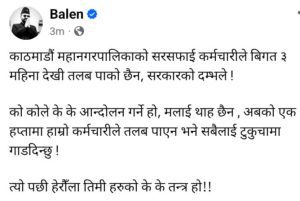 बालेनको मध्यरातमा कडा स्टाटस- एक हप्तामा कर्मचारीले तलब पाएनन् भने सबैलाई टुकुचामा गाडिदिन्छु