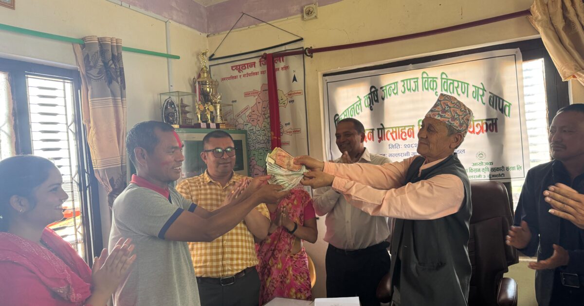 गतवर्ष ५ जना कृषकबाट शुरु भएको यस्तो अनुदान कार्यक्रममा पछिल्लो त्रैमासिकमा २३ जना कृषकहरु सहभागी भएका छन् । फलपूmल, सिमिको बीऊ, तरकारी, बेसार, अण्डा क्यारेट, ध्यू, च्याउ उत्पादन गर्ने किसानहरुले यो त्रैमासिकमा अनुदान वापतको रकम प्राप्त गरेका छन् । न्यूनतम उत्पादनको परिणाम निर्धारण गरेर सो लक्ष्य पुरा गर्ने किसानहरुलाई प्रति केजिका आधारमा पालिकाले अनुदान उपलब्ध गराउने गरेको छ । कृषि र पशुजन्य उत्पादनहरुमा उत्पादन परिणामका आधारमा अनुदान दिने गरेको हो ।