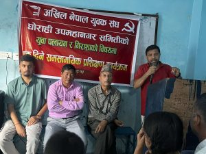 अखिल नेपाल युवक संघ घोराही उपमहानगर समितिका अध्यक्ष श्रीराम भट्टराईको अध्यक्षतामा भएको कार्यक्रममा स्वागत मन्तव्य नगर उपाध्यक्ष महेश आचार्यले र सञ्चालन नगर सचिव दिपक केसीले गर्नुभएको थियोे।