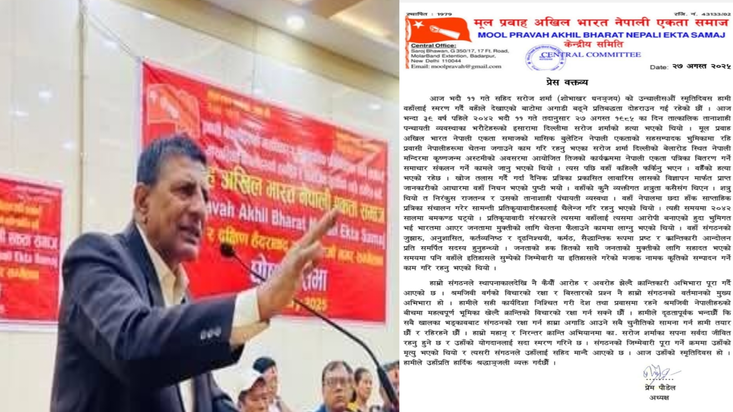 मूल प्रवाह अखिल भारत नेपाली एकता समाजले सहिद सरोज शर्मा “शोभाकर धनञ्जय”को ३६औँ स्मृति दिवसको अवसरमा श्रद्धाञ्जली अर्पण गरेको छ। सन् १९८८ को अगष्ट २६ मा तत्कालीन निरङ्कुश पञ्चायती व्यवस्थाविरुद्ध संघर्षरत् शर्मा दिल्लीमा आयोजित कार्यक्रममा सहभागी हुँदै गर्दा क्रूरतापूर्वक हत्या गरिएका थिए।