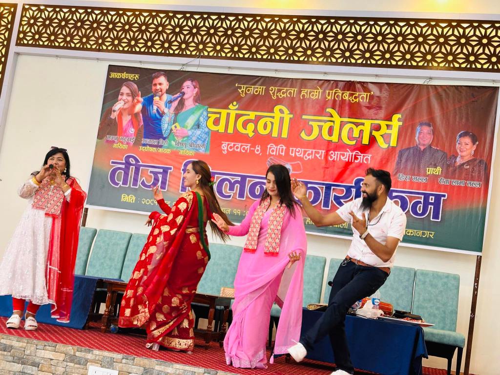 आफ्ना सम्पूर्ण महिला ग्राहकहरुलाई निम्तो गरी ज्वेलर्सले गत बिहीबार तीजमिलनसंगै दर खुवाएको छ । बुटवल –११ कालिकानगरस्थ्ति दियालो फुडल्याण्डमा आयोजित उक्त कार्यक्रममा करिब दुई सय जना महिलाहरुको सहभागिता रहेको थियो । उक्त कार्यक्रममा कलाकारहरु उज्जवल गिरी, विष्णु श्रीपाली, मन्जु भट्टराई लगायका सांगितिक प्रस्तुती समेत रहेको थियो । उक्त कार्यक्रममा कलाकारहरुले मौलिक तीज भाका आफै मादल बजाएर दर्शकहरुलाई मनोरन्जन गरेका थिए ।