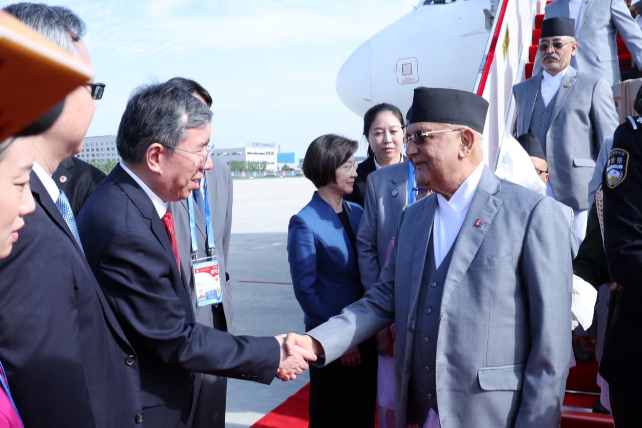 मित्रराष्ट्र चीनका राष्ट्रपति सी चिनफिङको निमन्त्रणामा सरकारी प्रतिनिधिमण्डलको नेतृत्व गर्दै ओली दिउँसो ३ः१५ बजे हिमालय एयरलाइन्सको विशेष विमानमार्फत थियानजिन विनहाइ अन्तर्राष्ट्रिय विमानस्थलमा अवतरण गरेका हुन्।