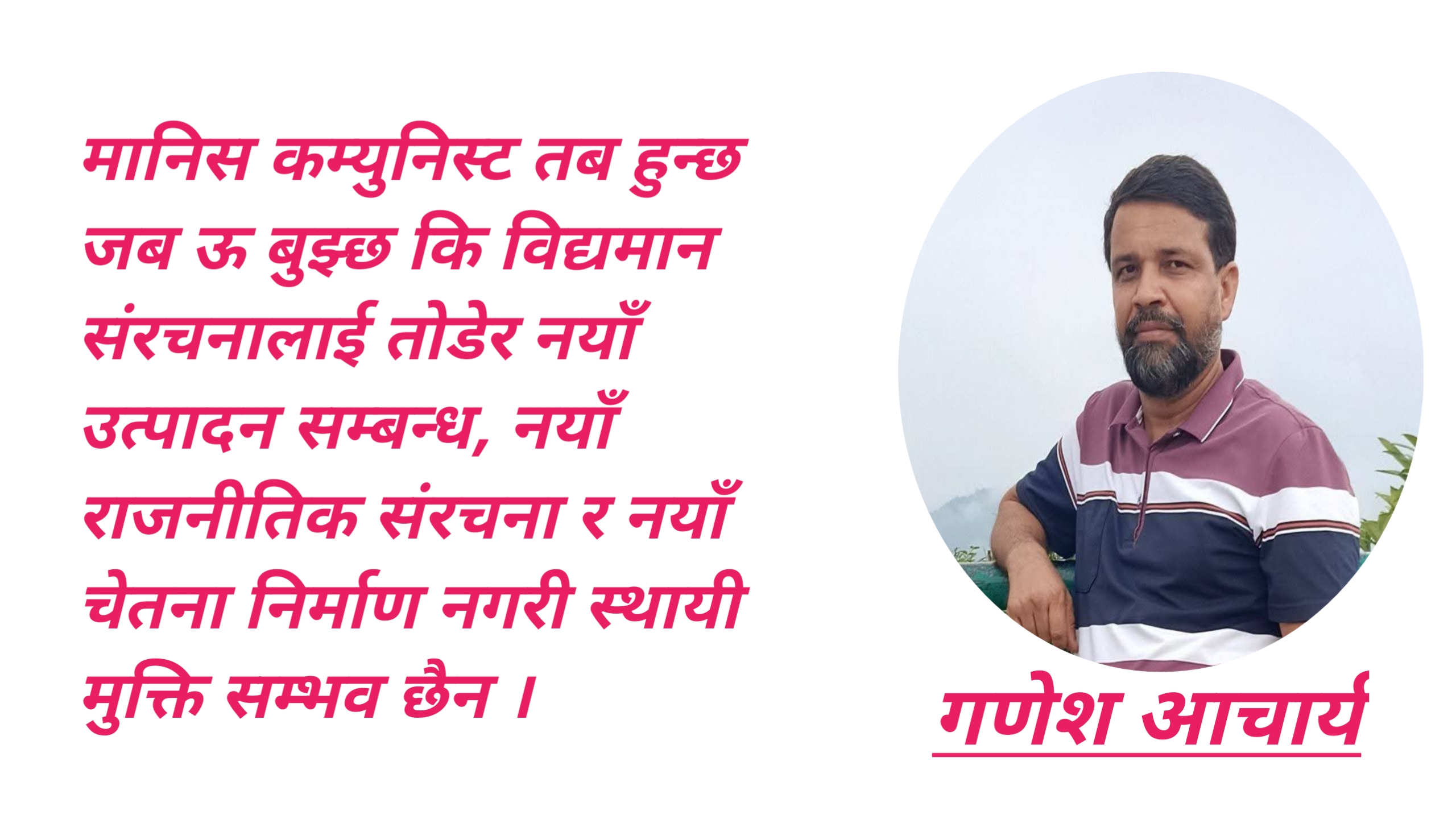कम्युनिस्ट चेतना केवल भावनात्मक आक्रोश होइन । यो वैज्ञानिक भविष्यदृष्टि हो । मार्क्सले देखाए कि सुधार वा कानुनी पैचाले मात्र शोषण अन्त्य हुँदैन । “दर्शनलाई वास्तविक बनाउनका लागि श्रमिक वर्गलाई सशक्त बनाउनु पर्छ, भन्ने एङ्गेल्सको भनाइ आज पनि उत्तिकै प्रासंगिक छ । मानिस कम्युनिस्ट तब हुन्छ जब ऊ बुझ्छ कि विद्यमान संरचनालाई तोडेर नयाँ उत्पादन सम्बन्ध, नयाँ राजनीतिक संरचना र नयाँ चेतना निर्माण नगरी स्थायी मुक्ति सम्भव छैन ।
