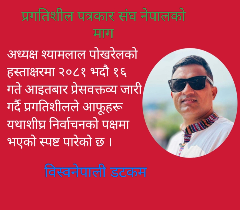 “नेपाल पत्रकार महासङ्घले आजै प्रेसविज्ञप्ति जारी गरी आगामी २०८१ असोज ५ गते सबै तहको निर्वाचन घोषणा गरेकोप्रति हाम्रो सङ्गठन प्रगतिशील पत्रकार सङ्घ, नेपालको गम्भीर ध्यान आकर्षण भएको छ ।