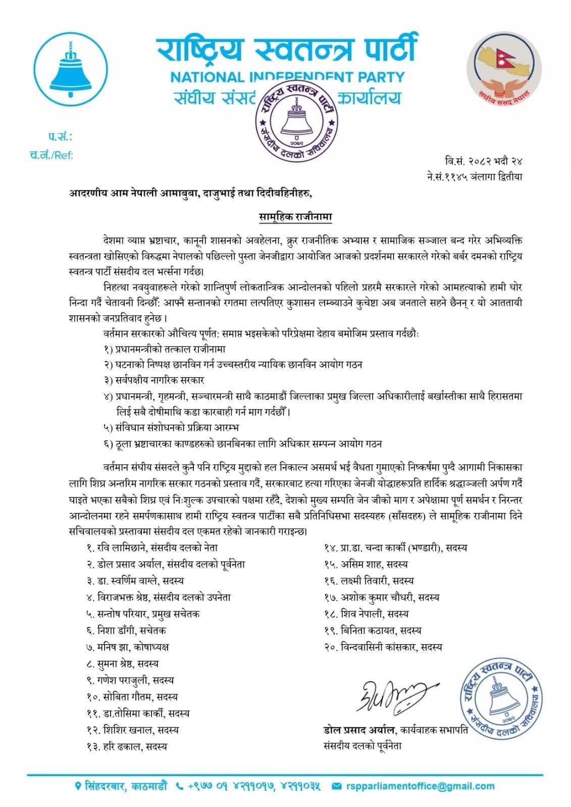 काठमाडौं, – राष्ट्रिय स्वतन्त्र पार्टीका संसद सदस्यहरूले आज संसदमा सामूहिक रूपमा राजीनामा दिएका छन्। पार्टीका नेताहरूले आफ्नो निर्णय राजनीतिक असहमति र हालको व्यवस्थाप्रति असन्तुष्टिका कारण भएको बताएका छन्।