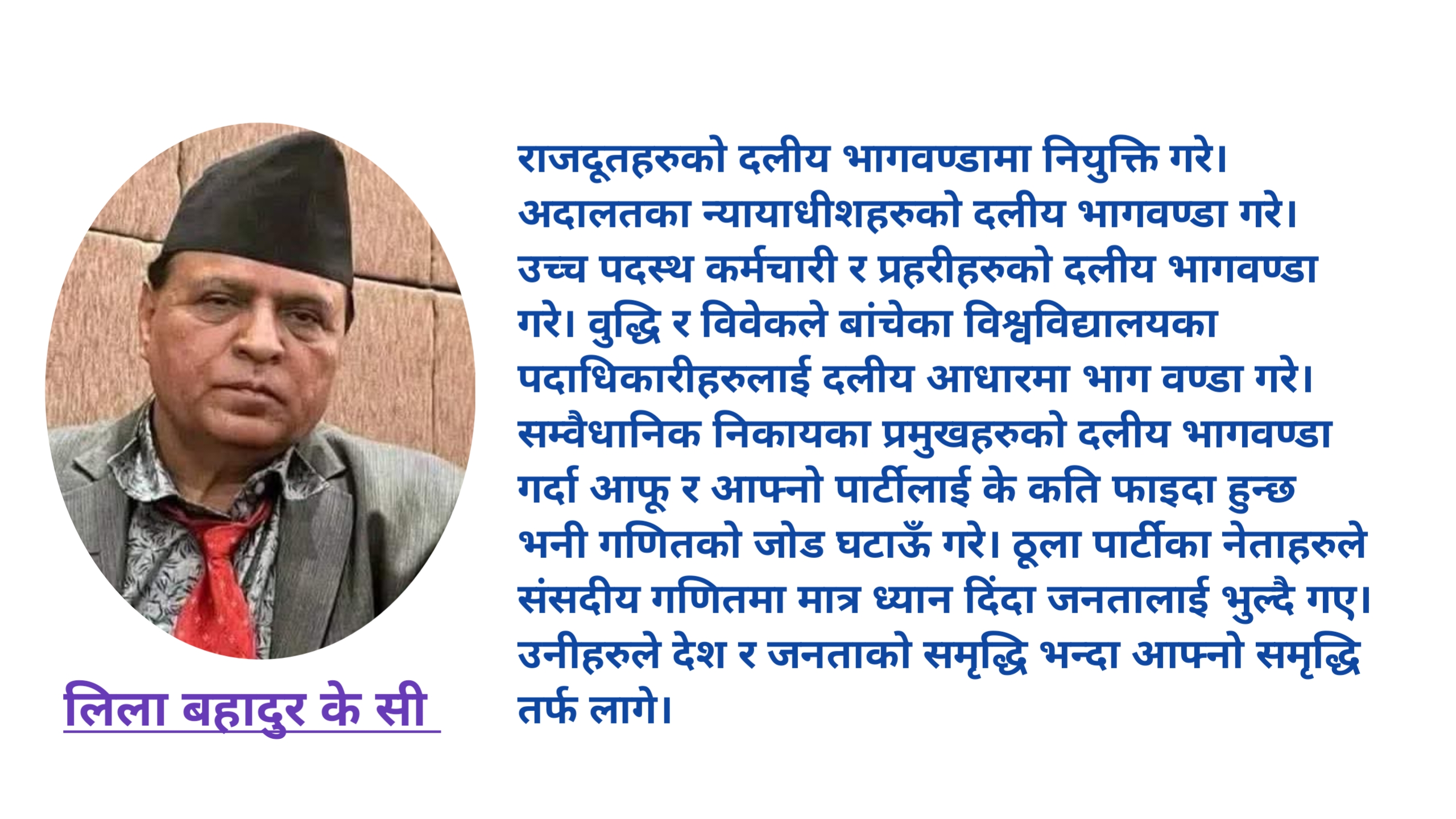 उनीहरुलाई फगत ताली पड्काउने पात्रको रुपमा प्रयोग गरे। राजदूतहरुको दलीय भागवण्डामा नियुक्ति गरे। अदालतका न्यायाधीशहरुको दलीय भागवण्डा गरे। उच्च पदस्थ कर्मचारी र प्रहरीहरुको दलीय भागवण्डा गरे। वुद्धि र विवेकले बांचेका विश्वविद्यालयका पदाधिकारीहरुलाई दलीय आधारमा भाग वण्डा गरे।सम्वैधानिक निकायका प्रमुखहरुको दलीय भागवण्डा गर्दा आफू र आफ्नो पार्टीलाई के कति फाइदा हुन्छ भनी गणितको जोड घटाऊँ गरे। ठूला पार्टीका नेताहरुले संसदीय गणितमा मात्र ध्यान दिंदा जनतालाई भुल्दै गए। उनीहरुले देश र जनताको समृद्धि भन्दा आफ्नो समृद्धि तर्फ लागे। पार्टीका अध्यक्षलाई रिझाएर, नजराना टक्राएर चुनावमा टिकट लिई जित्ने, जिते पछी चुनाव खर्च उठाउन मन्त्री बन्न मरिहत्ते गर्ने, मन्त्री बने पछी भ्रष्टाचार गर्ने र त्यहि भ्रष्टाचार गरेर कमाएको अकूत सम्पत्तिले फेरी चुनाव जित्ने ; यही प्रक्रिया वारम्वार दोहोर्याई आर्यघाट जाने वेलासम्म सत्ता, शक्ति र सरकारमा रहिरहने नीतिलाई यीनीहरुले जीवनको शुत्र बनाए।