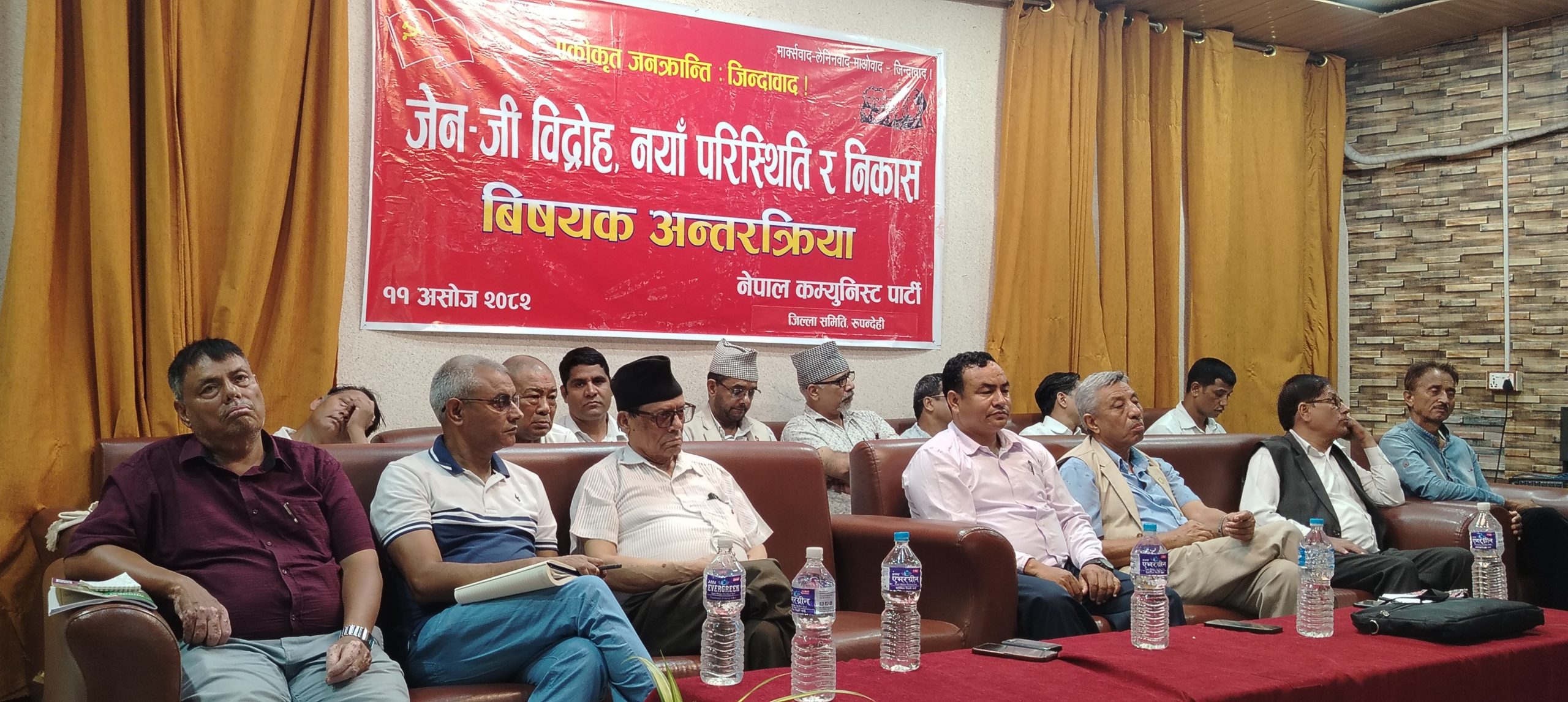 नेकपा रुपन्देहीको आयोजनामा शनिबार ‘जेनजि विद्रोह : नयाँ परिस्थिति र निकास’ विषयक अन्तरक्रिया कार्यक्रम सम्पन्न भएको छ । कार्यक्रममा विभिन्न राजनीतिक दलका नेता, पत्रकार, व्यवसायी तथा समाजका अगुवाहरूको उल्लेख्य उपस्थिति रहेको थियो ।