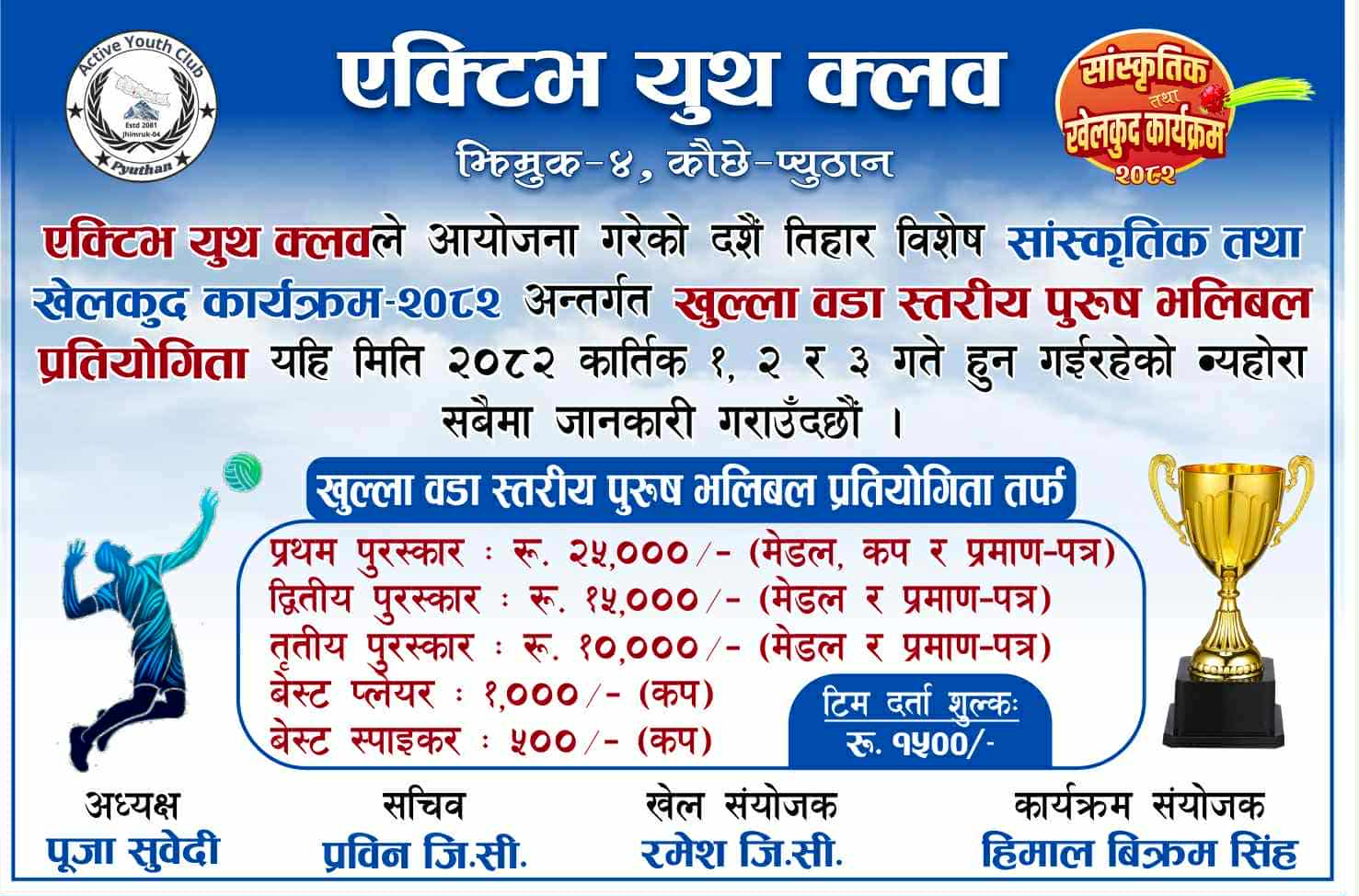 झिमरुक गाउँपालिका–४, प्यूठानस्थित एक्टिभ युथ क्लब (AYC) द्वारा आयोजना हुने दशैं–तिहार विशेष सांस्कृतिक तथा विविध कार्यक्रम–२०८२ अन्तर्गतको खुल्ला वडा स्तरीय पुरुष भलिबल प्रतियोगिताका लागि टिम दर्ता खुला गरिएको छ।