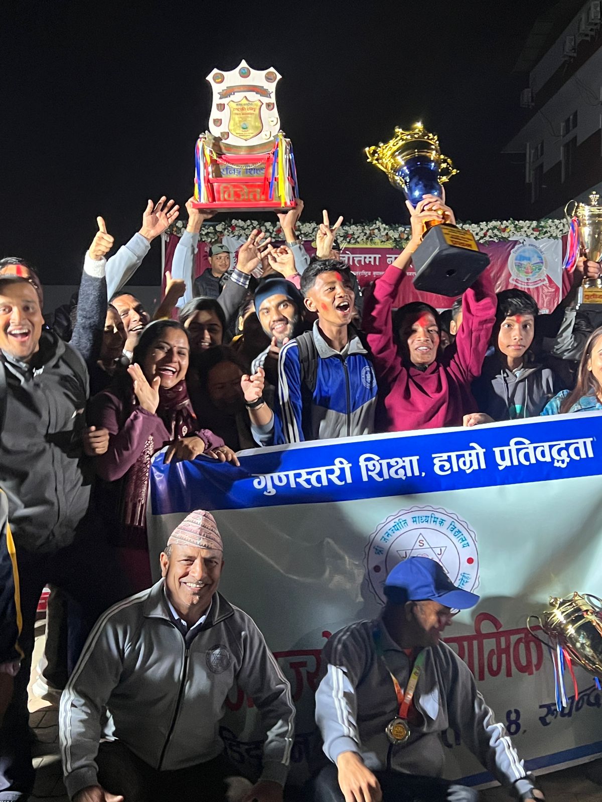उक्त बिद्यालयका विद्यालयका शिक्षक तथा अतिरिक्त क्रियाकलाप संयोजक पिताम्बर पराजुलीले दिएको जानकारी अनुसार प्रतियोगितामा सुबम बमरेलले १०० मिटर र २०० मिटर दौडमा स्वर्ण जित्दै दोहोरो सफलता हासिल गरे। भने ४०० मिटर दौडमा राहुल स्यान्ताङ स्वर्ण पदकका विजेता बने। १००×४ रिले दौडतर्फ छात्र टोलीले समेत स्वर्ण पदक हात पार्न सफल भयो। हाइजम्पतर्फ मनिका थापा र सटपुटतर्फ दिपेश आलेले स्वर्ण पदक जिते।