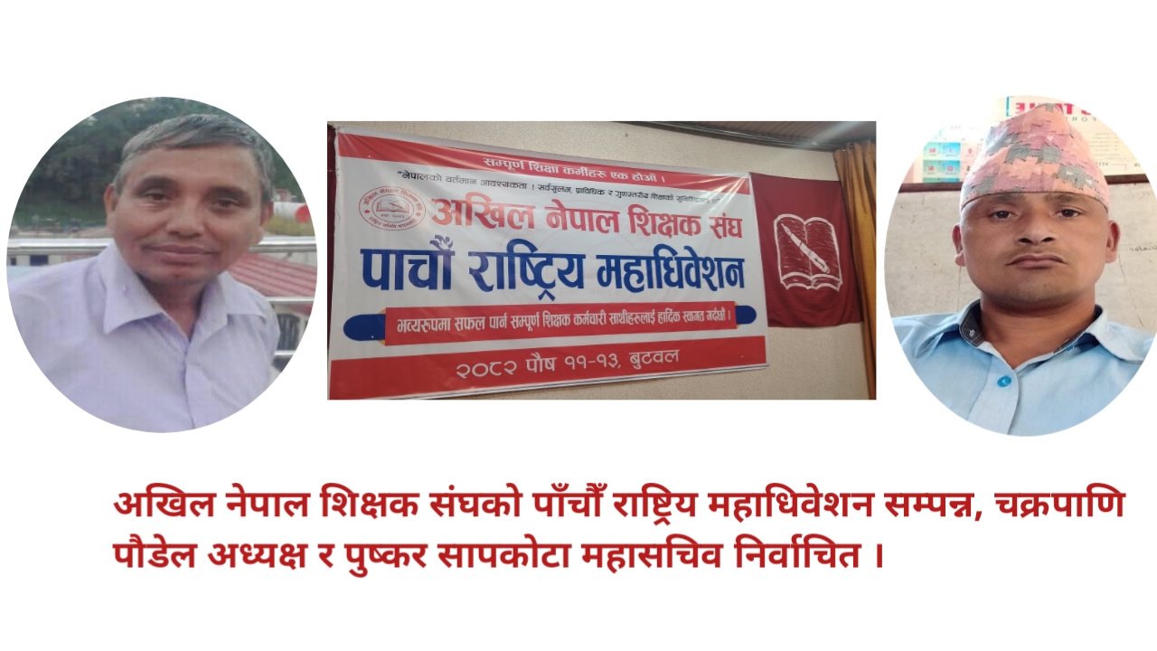बुटवल । अखिल नेपाल शिक्षक संघको पाँचौँ राष्ट्रिय महाधिवेशन यही पौष ११, १२ र १३ गते बुटवलमा सम्पन्न भएको छ। महाधिवेशनले अध्यक्षमा चक्रपाणि पौडेल र महासचिवमा पुष्कर सापकोटालाई सर्वसहमत रूपमा चयन गरेको छ।